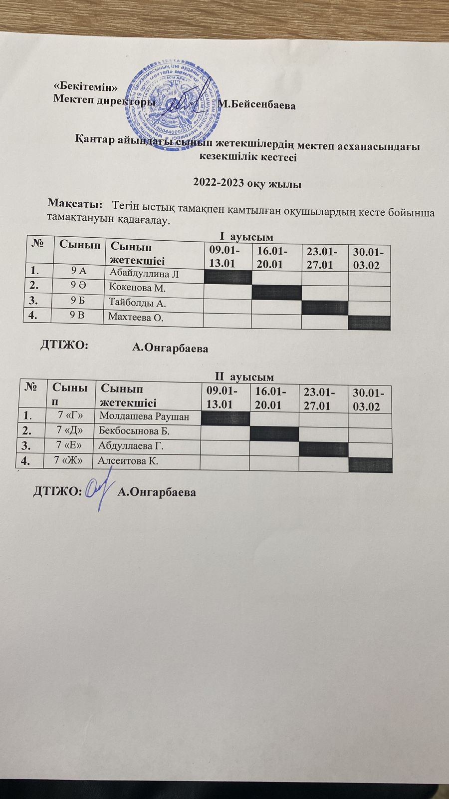 Қаңтар айындағы мектеп асханасындағы кезекшілік кестесі