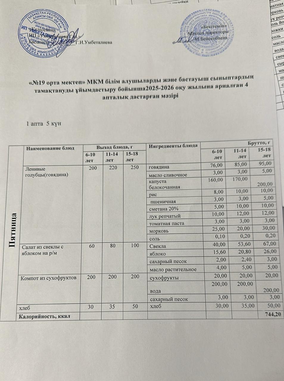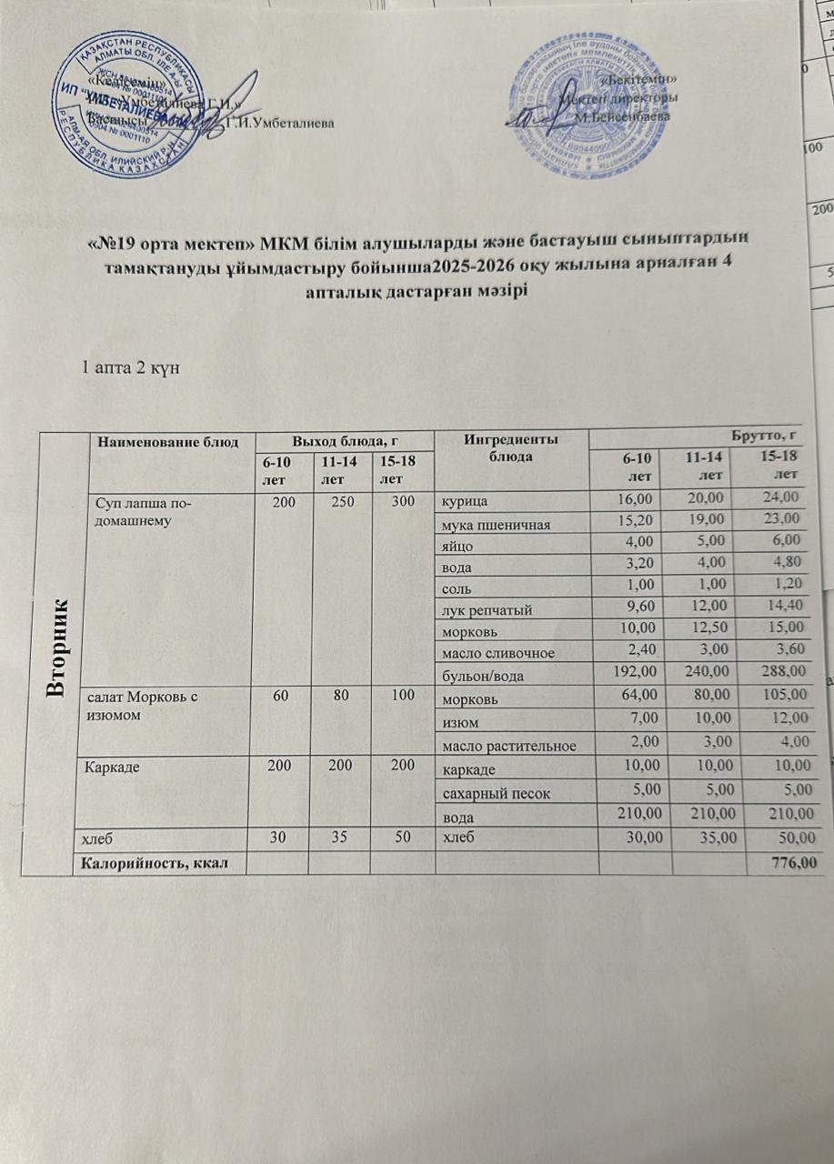 2025-2026 оқу жылына арналған 4 апталық дастархан мәзірі » №19 ОРТА МЕКТЕП