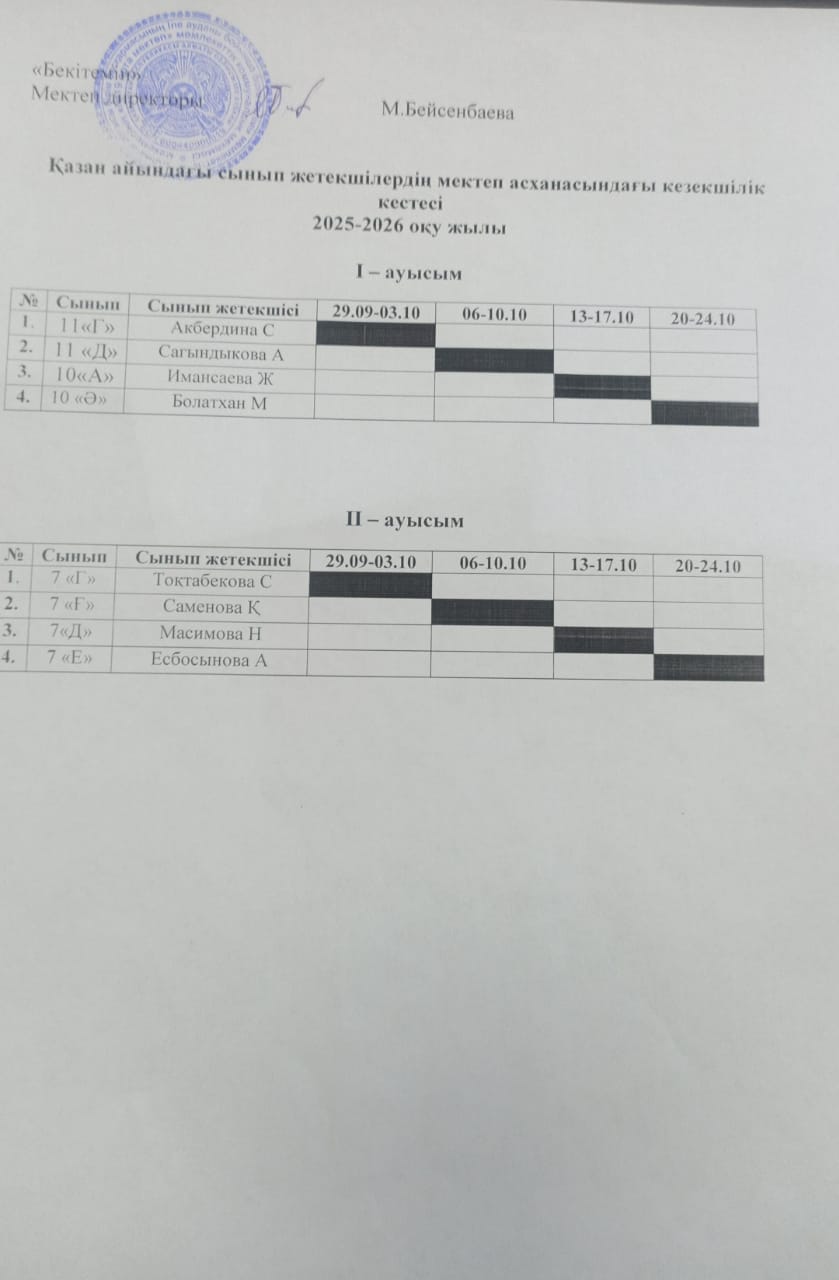 01 октябрь 2025 0 1 2 3 4 5 Қазан айындағы сынып жетекшілердің мектеп асханасындағы кезекшілік кестесі 2025-2026 оқу жылы