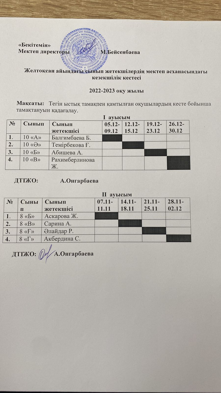 Желтоқсан айындағы мектеп асханасындағы кезекшілік кестесі
