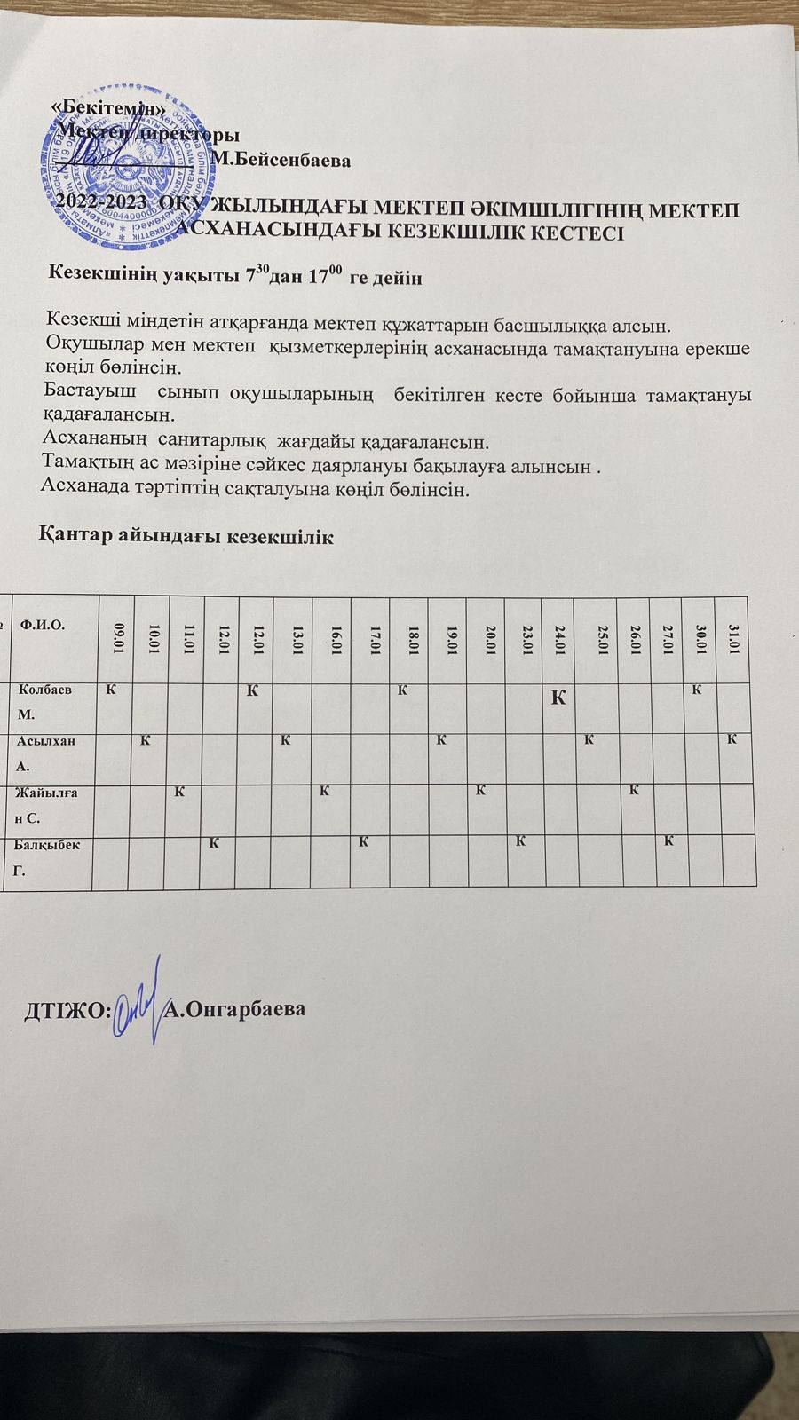 Қаңтар айындағы мектеп асханасындағы кезекшілік кестесі