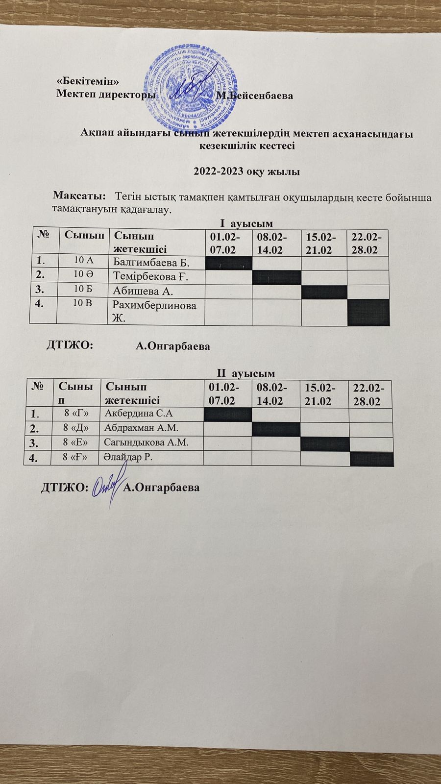 Ақпан айындағы мектеп асханасындағы кезекшілік кестесі