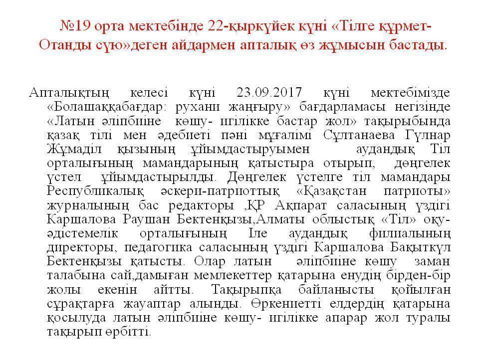 «Тілге құрмет- Отанды сүю» » №19 ОРТА МЕКТЕП