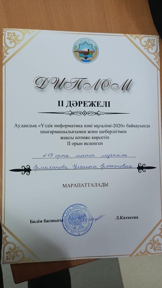 Жаңа технология ғасырына қадам басқан мемлекетімізде білім саласына жүктелетін талап жоғары. Оқытудың ақпараттық-технологиясын пайдалану-сапалы білім негізі. Осы орайда N19 орта мектебінің информатика пәні мұғалімдерінің еңбектерін орасан зор деп айтуға болады. Соның бір дәлелі, 12.02.2020ж күні өткізілген аудандық "Ең үздік информатика пәні мұғалімі-2020" байқауында информатика пәні мұғалімі Ермаханова Ұлғаным Ермаханқызы жүлделі II орынды иеленіп, білім бөлімі басшысының ІІ дәрежелі дипломымен марапатталды. Құттықтаймыз!!!