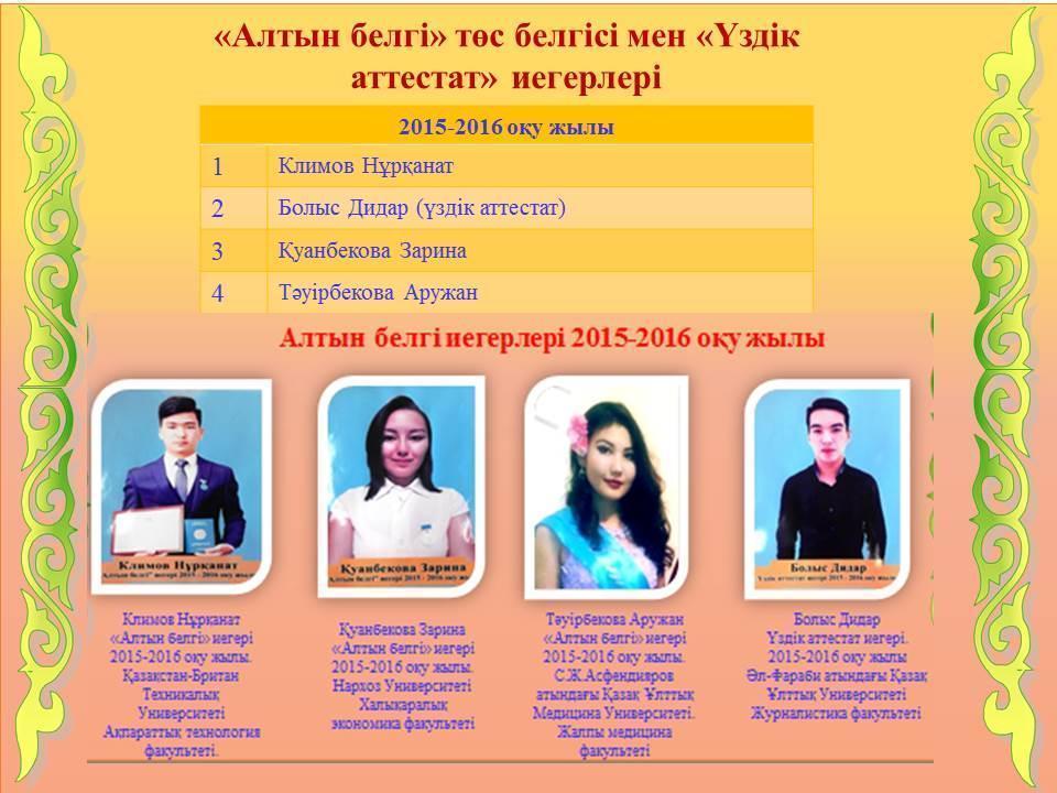 Алтын белгі иегерлері » №19 ОРТА МЕКТЕП