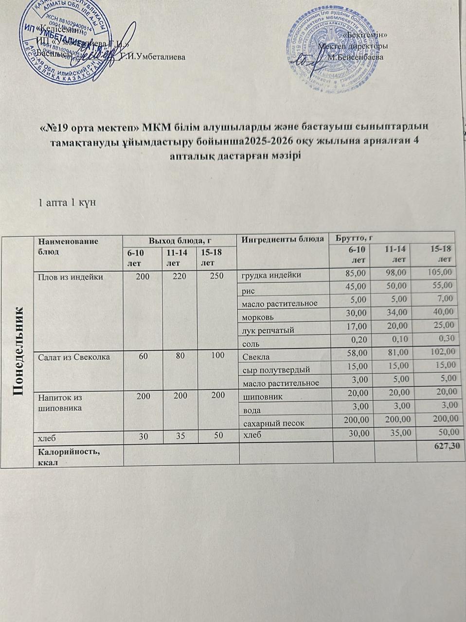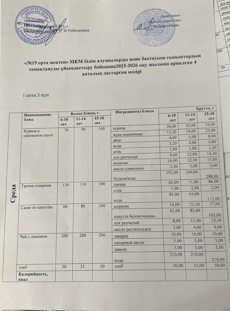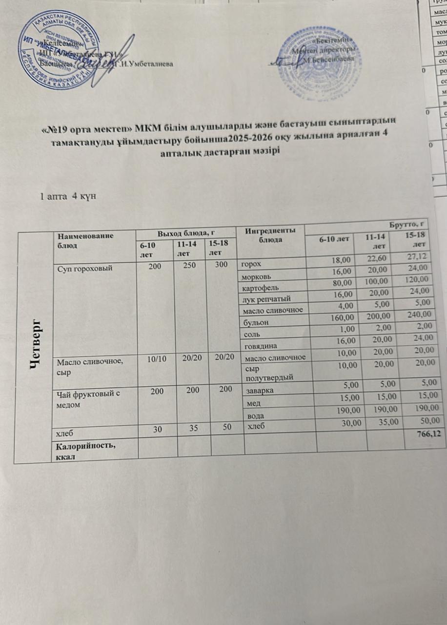 2025-2026 оқу жылына арналған 4 апталық дастархан мәзірі » №19 ОРТА МЕКТЕП